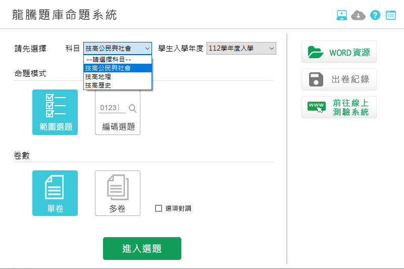112學年上學期 技術高中命題光碟 龍騰版 社會科(地理、歷史、公民與社會科)(108課綱) 題庫光碟